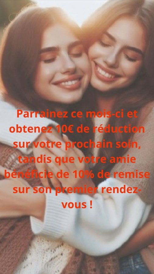 Pour chaque amie que vous parrainez ce mois-ci, vous recevez 10€ de remise sur votre prochain soin.